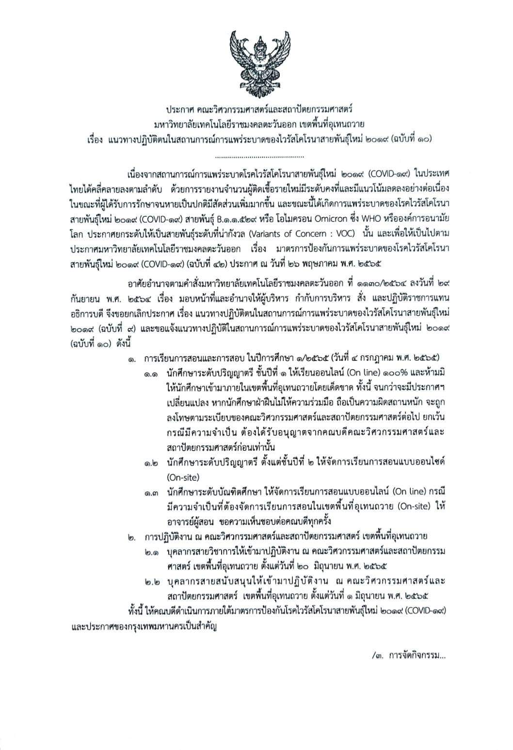 ๑.๑ นักศึกษาระดับปริญญาตรี ชั้นปีที่ ๑ ให้เรียนออนไลน์ (Online) ๑๐๐% และห้ามมิให้นักศึกษาเข้ามาภายในเขตพื้นที่อุเทนถวายโดยเด็ดขาด ทั้งนี้ จนกว่าจะมีประกาศฯ เปลี่ยนแปลง หากนักศึกษาฝ่าฝืนไม่ให้ความร่วมมือ ถือเป็นความผิดสถานหนัก จะถูกลงโทษตามระเบียบของคณะวิศวกรรมศาสตร์และสถาปัตยกรรมศาสตร์ต่อไป ยกเว้นกรณีมีความจำเป็น ต้องได้รับอนุญาตจากคณบดีคณะวิศวกรรมศาสตร์และสถาปัตยกรรมศาสตร์ก่อนเท่านั้น