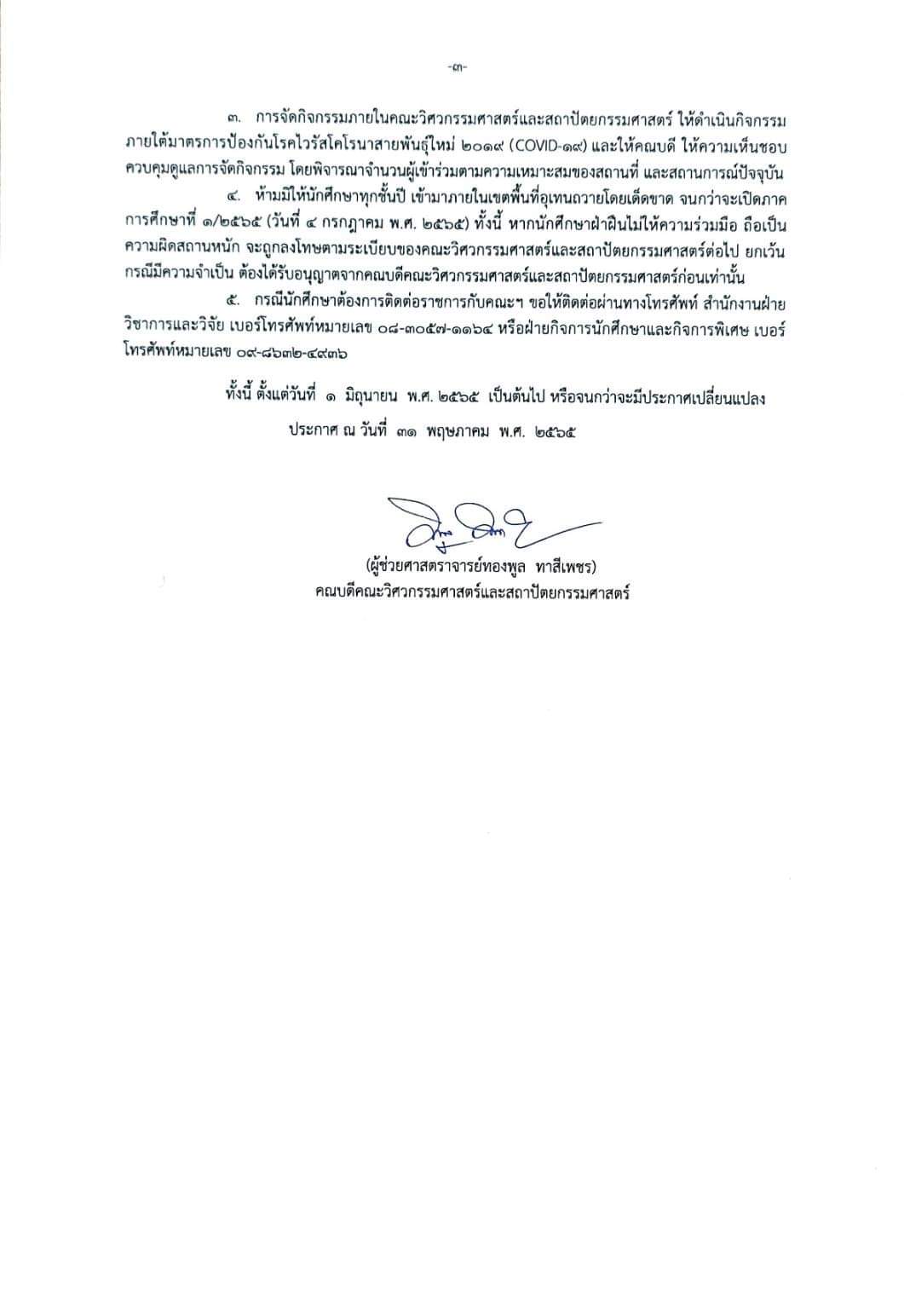 ๔. ห้ามมิให้นักศึกษาทุกชั้นปี เข้ามาภายในเขตพื้นที่อุเทนถวายโดยเด็ดขาด จนกว่าจะเปิดภาคการศึกษาที่ ๑/๒๕๖๕ (วันที่ ๔ กรกฎาคม พ.ศ. ๒๕๖๕) ทั้งนี้ หากนักศึกษาฝ่าฝืนไม่ให้ความร่วมมือ ถือเป็นความผิดสถานหนัก จะถูกลงโทษตามระเบียบของคณะวิศวกรรมศาสตร์และสถาปัตยกรรมศาสตร์ต่อไป ยกเว้นกรณีมีความจำเป็น ต้องได้รับอนุญาตจากคณบดีคณะวิศวกรรมศาสตร์และสถาปัตยกรรมศาสตร์ก่อนเท่านั้น